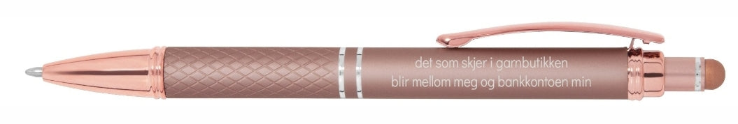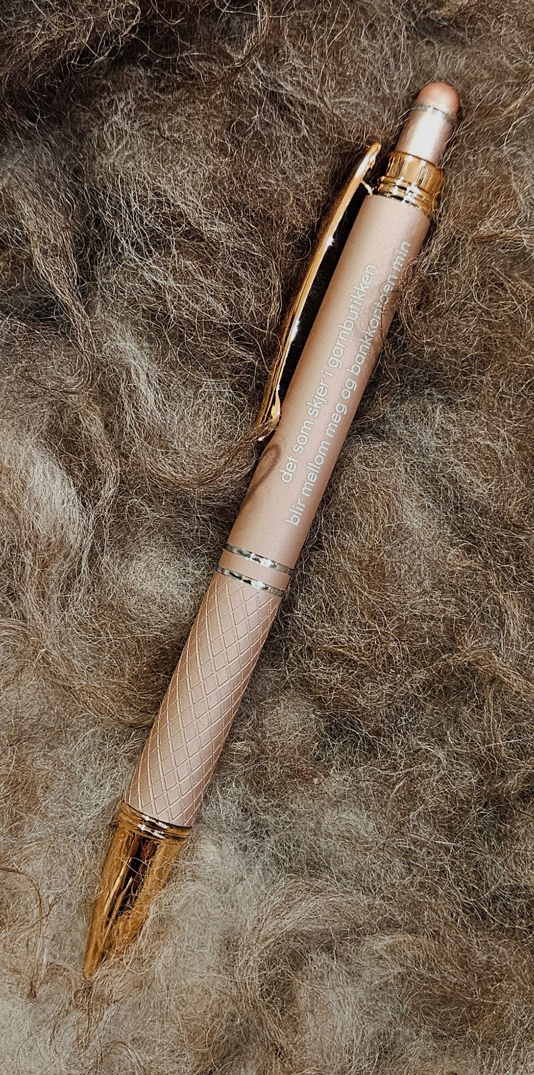 Denne penna kommer i rosegull, med svart blekk og sølvgravert trykk. Trykket er diskret og varig, siden det er gravert. Godt grep med diamantgraveringer.