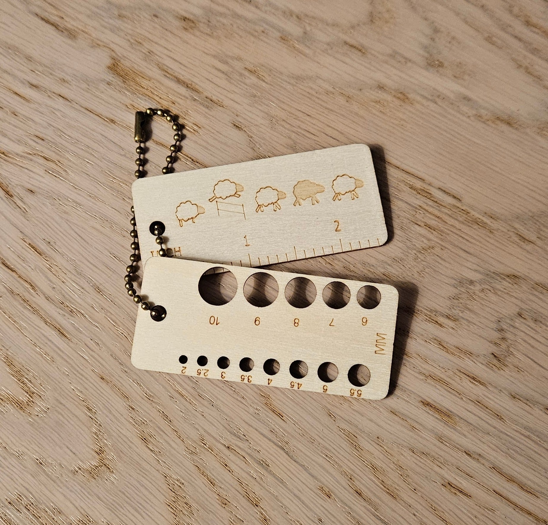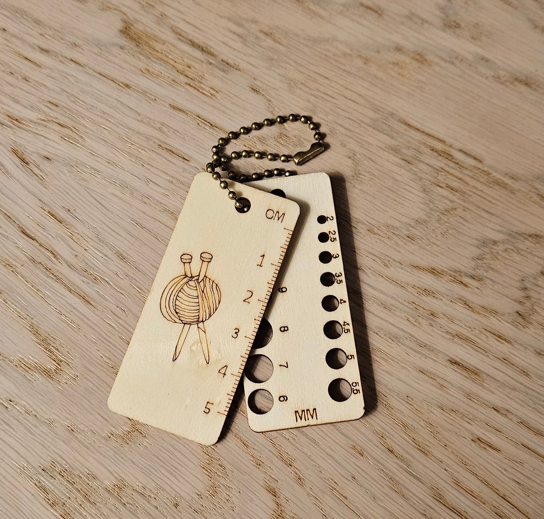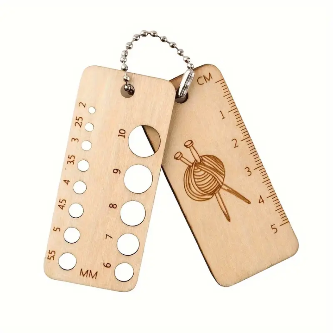 Søt og praktisk nøkkelring i tre med cm, inch og pinnestørrelser på. Perfekt når du er på reise og må sjekke pinnestørrelse eller om vrangborden er lang nok.